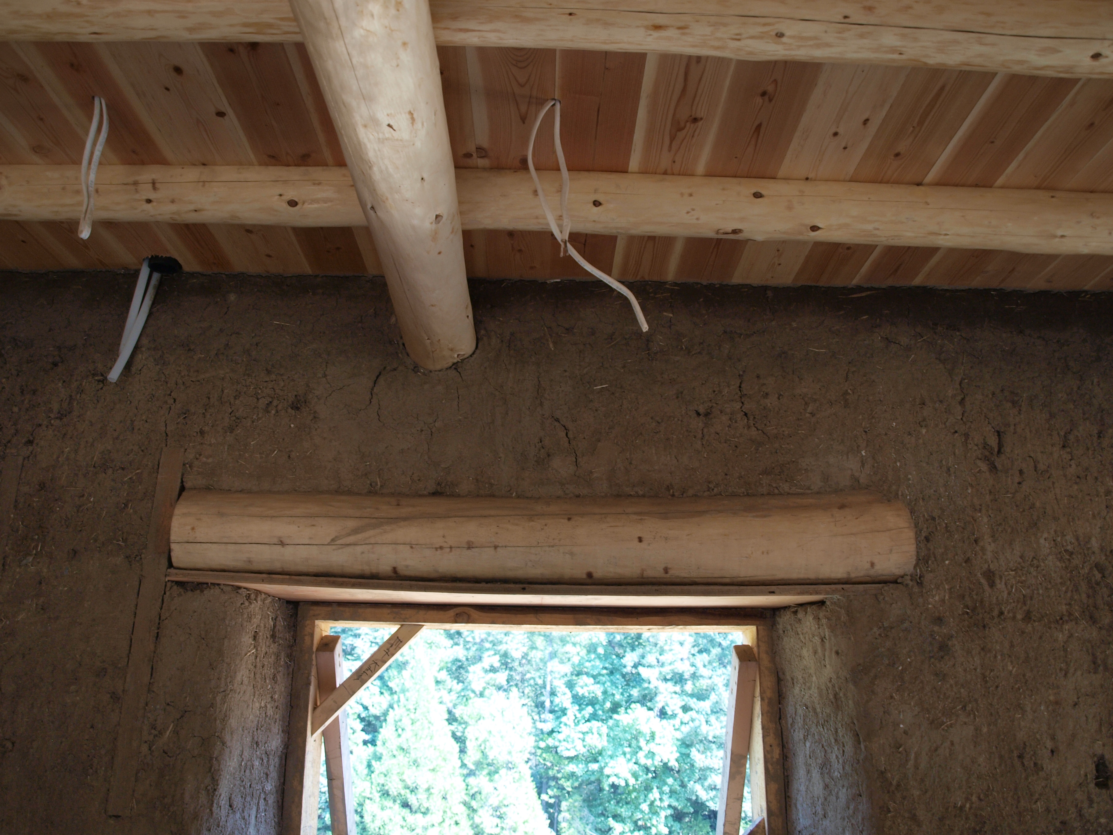 detalle de refuerzo del dintel de una ventana sobre la que apoya una viga. Todo en un muro de cob