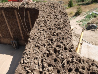 Superficie de un muro de cob en construcción. Se puede apreciar que queda rugosa para que la siguiente capa se agarre mejor