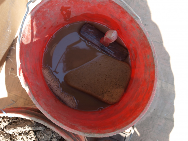 Utensilios para utilizar en la construcción con cob: Cubo con agua, brochas y esponjas